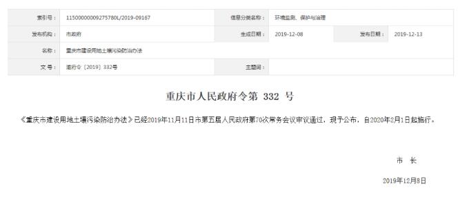 根據(jù)《中華人民共和國(guó)土壤污染防治法》、《重慶市環(huán)境保護(hù)條例》和有關(guān)法律法規(guī),結(jié)合重慶實(shí)際情況,2019年11月11日重慶市第五屆人民政府第70次常務(wù)會(huì)議審議通過(guò)了《重慶市建設(shè)用地土壤污染防治辦法》【重慶市人民政府令第 332 號(hào)】,該辦法已于2020年2月1日起正式施行。