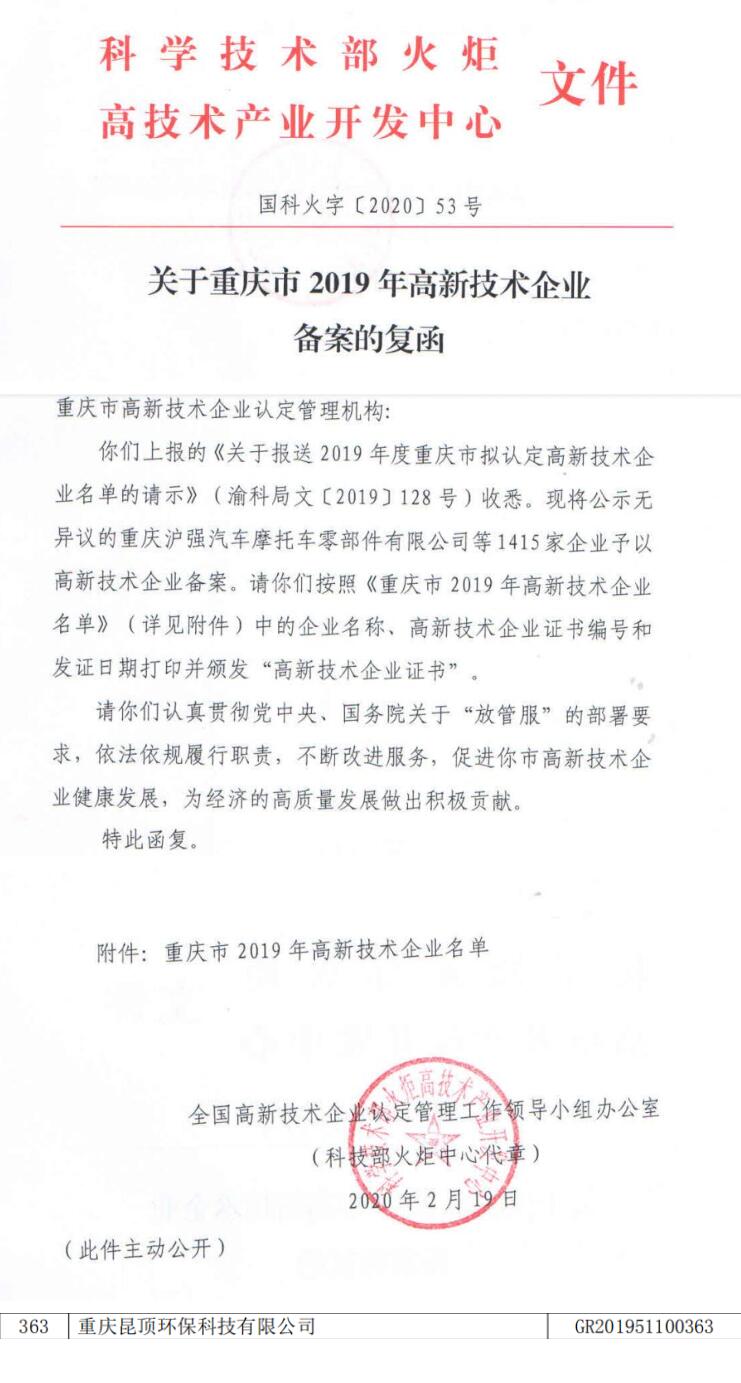 經(jīng)重慶市科技局初審、國(guó)家科技部復(fù)審,并根據(jù)國(guó)家《高新技術(shù)企業(yè)認(rèn)定管理辦法》和《高新技術(shù)企業(yè)認(rèn)定管理工作指引》的相關(guān)規(guī)定,重慶昆頂環(huán)??萍加邢薰颈徽J(rèn)定為“國(guó)家級(jí)高新技術(shù)企業(yè)”(GR201951100363)。 國(guó)家高新技術(shù)企業(yè)是指在國(guó)家重點(diǎn)支持的高新技術(shù)領(lǐng)域內(nèi),持續(xù)進(jìn)行研究開(kāi)發(fā)與技術(shù)成果轉(zhuǎn)化,形成企業(yè)核心自主知識(shí)產(chǎn)權(quán),并以此為基礎(chǔ)開(kāi)展經(jīng)營(yíng)活動(dòng)的企業(yè),屬于國(guó)內(nèi)領(lǐng)先或國(guó)際先進(jìn)的企業(yè)。 “國(guó)家高新技術(shù)企業(yè)”認(rèn)定,是由國(guó)務(wù)院頒布的認(rèn)證資質(zhì)和條件,并由財(cái)政部、科技部、稅務(wù)總局聯(lián)合負(fù)責(zé)認(rèn)定管理工作。該資質(zhì)對(duì)于企業(yè)核心技術(shù)的自主知識(shí)產(chǎn)權(quán)數(shù)量、研發(fā)團(tuán)隊(duì)、銷(xiāo)售與總資產(chǎn)成長(zhǎng)性、科技成果轉(zhuǎn)化力等各個(gè)方面都有極其嚴(yán)格的要求,我公司能最終獲得認(rèn)定,說(shuō)明公司在新一代環(huán)保技術(shù)創(chuàng)新研發(fā)方面得到國(guó)家的大力支持和認(rèn)可,同時(shí),積極推動(dòng)了公司自主創(chuàng)新、自主研發(fā)的進(jìn)程。
