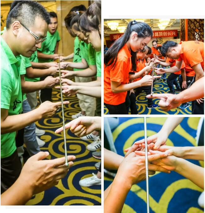 大家共同用食指支撐魚竿,不能有人手指離開魚竿的情況下將魚竿從頭至尾放到地上。取名簡單任務(wù)實則一點也不簡單,不允許有任何人出現(xiàn)失誤,一人不動則整體不動,一人動作快則導(dǎo)致整體分崩離析。